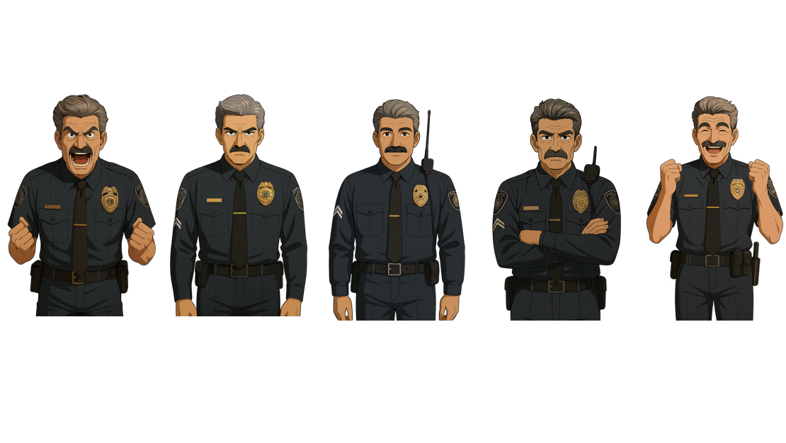 Unable to find suitable assets, I generated custom visuals using AI tools. Each version of Jim—anxious, aggressive, relieved—was illustrated with intent, reflecting the learner’s impact. Backgrounds, such as the police cruiser, grocery store, and precinct office, were also AI-generated to maintain cohesion.