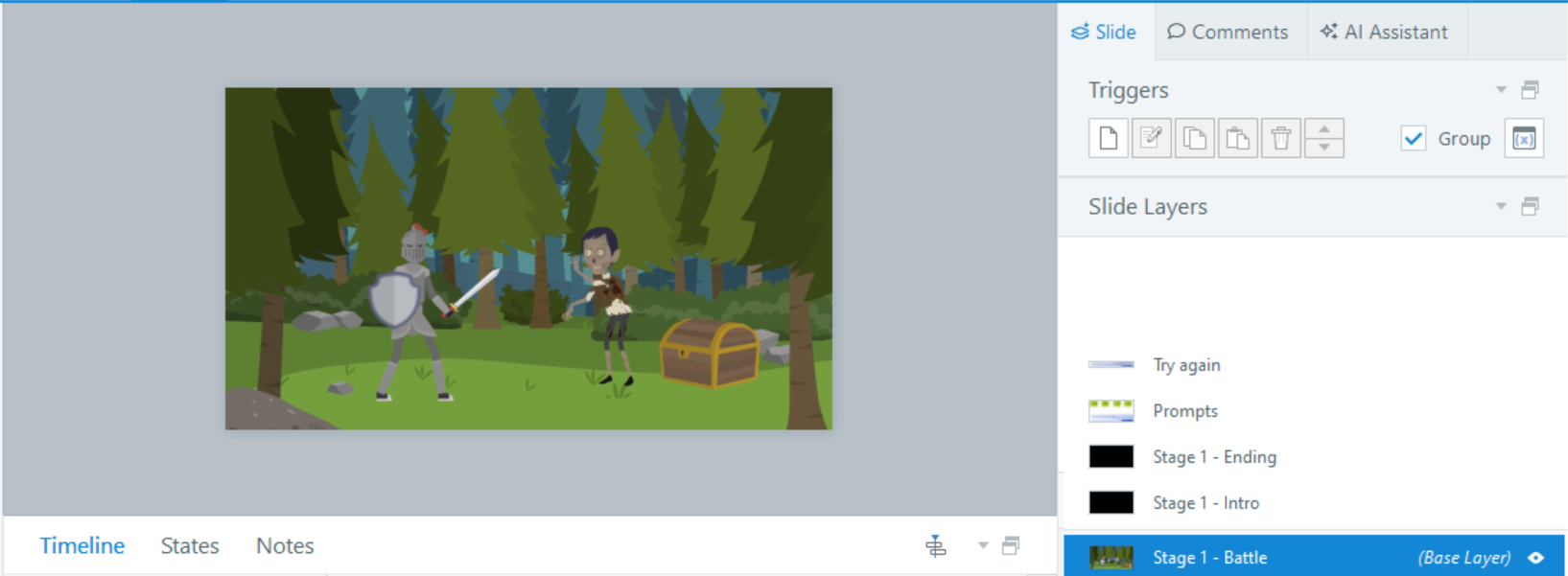 I used variables, triggers, layers, and states in Articulate Storyline to implement the interactive logic of the experience. Variables tracked progression and remaining attempts, while conditional triggers controlled navigation, feedback, and scene flow.
